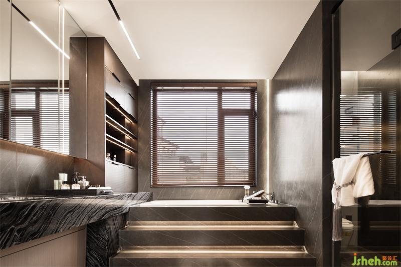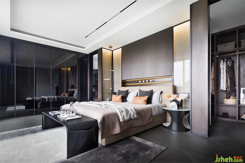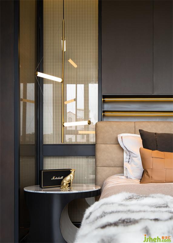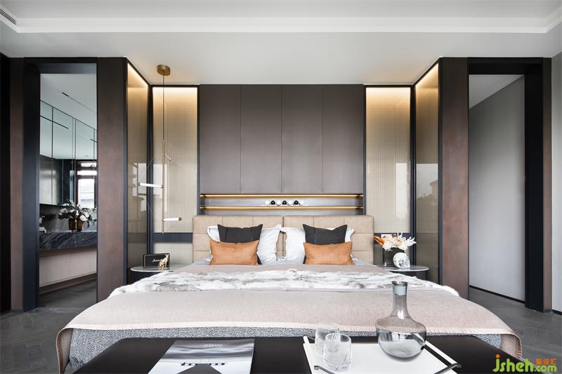 主卧从简约、低奢优雅的空间感受出发,延续整体低饱和度色彩特点,样板间设计并巧妙引入橙色进行整体空间提亮,在金属与灯光的加持下,仿佛在沉静中酝酿蓬勃的活力,让平和优雅的心境在此处生根发芽。