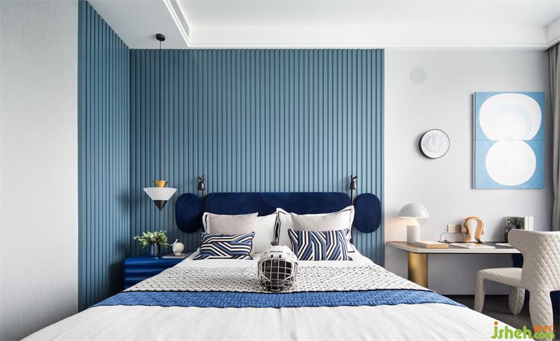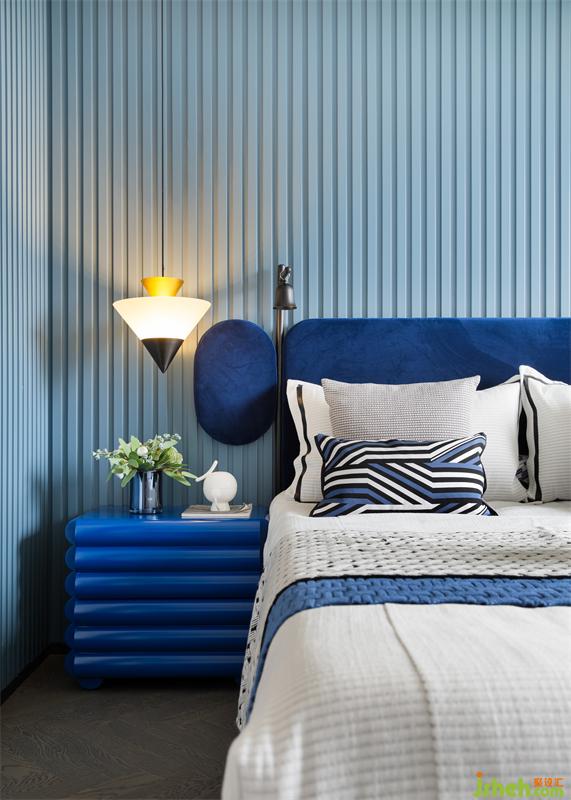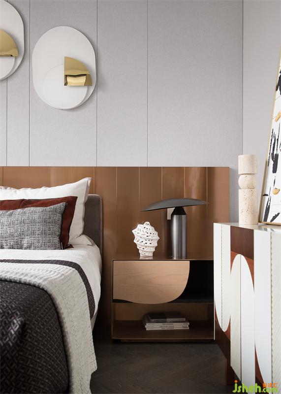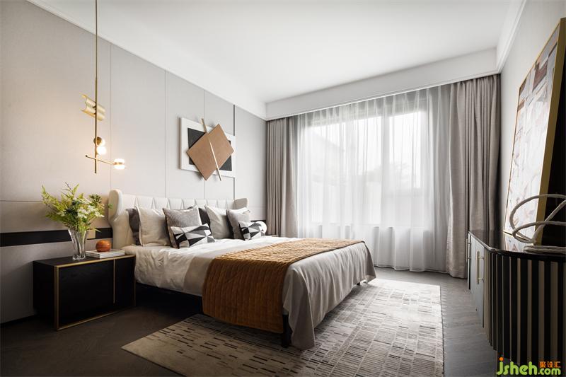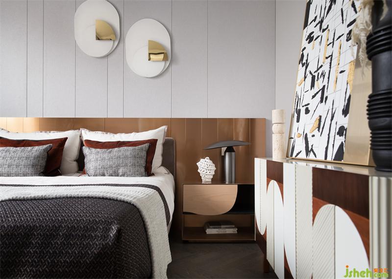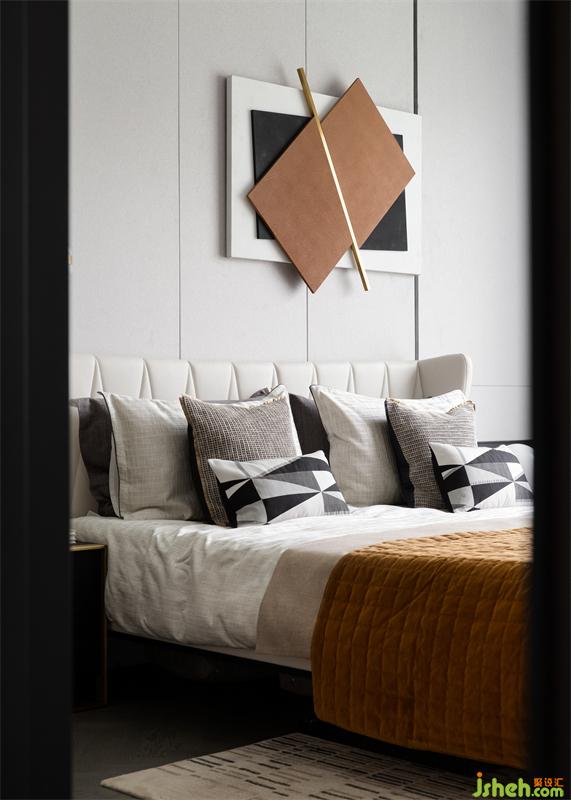样板间设计极具腔调的橙色床头背景、舒适温暖的布艺床品及几何装饰,碰撞出艺术的通感,形体碰撞,线条交错,渲染出生活的多面可能。