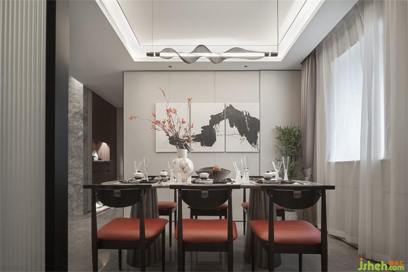 客餐厅空间线条简炼、材质朴拙,透过自然光线,物象、生态、人文实现有序应和。