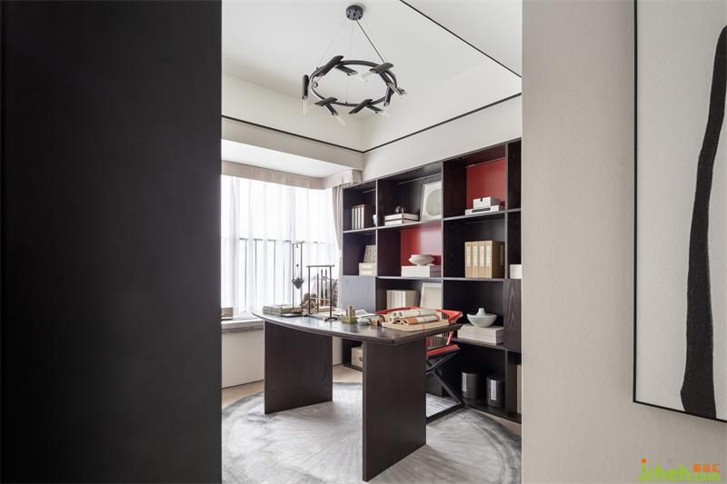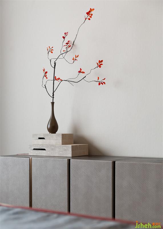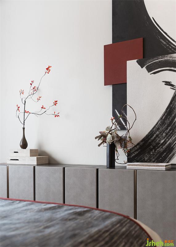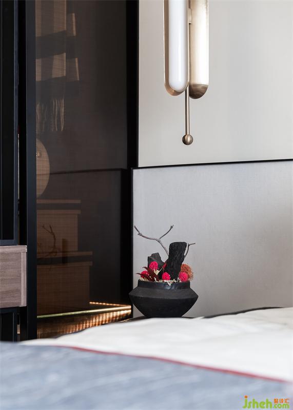 次卧山水画与红色绢花的交叠视效,令艺术叙事更富意趣。当阳光漫入室内,与空间形成自然的互动,斑驳的光影亦留下东方的痕迹。