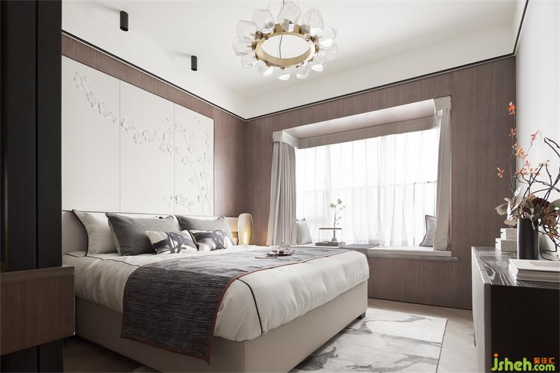 主卧的梅花皮雕切入诗意观游,抒绘一幅花叶攒动、暗香浮动的意境画面,在大面积木饰面与床头暖光灯的双重视觉重叠下,优雅又充斥着故事感。