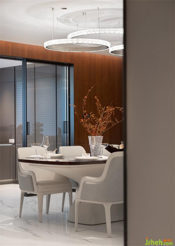 规整的空间极大地拓展了视觉的通透度,不同材质糅合于一体,深浅不一的色调中,餐厅以围合的方式,强调家人间的亲密。