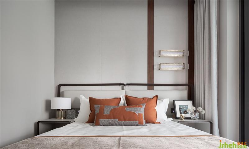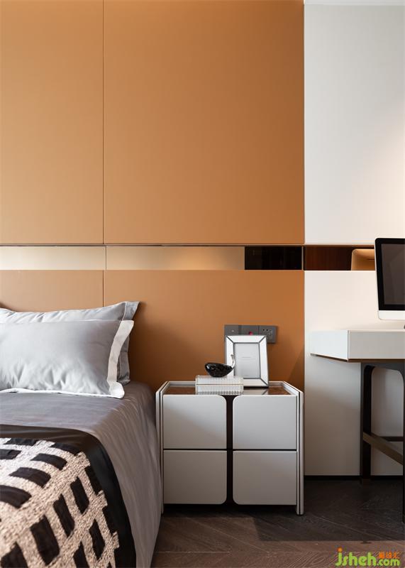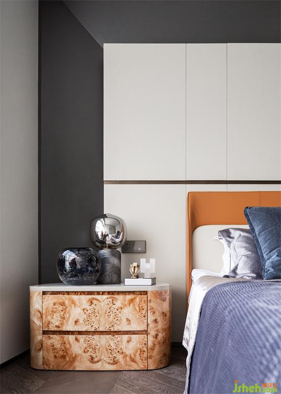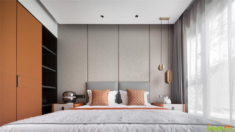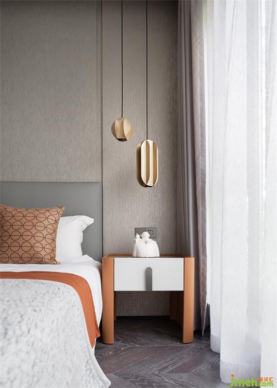 样板间设计请延续对自然、艺术属性的理解,长辈房以儒雅平和的色彩材质容纳主人的生活尺度,仅以低饱和度橙色提亮,在自然光的加持下散发出温柔而静谧的空间气质。
