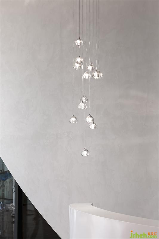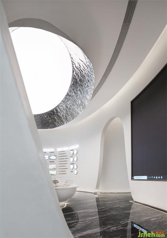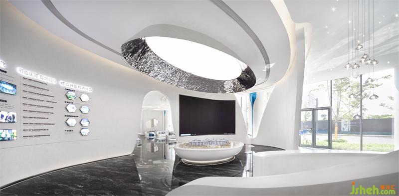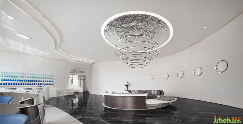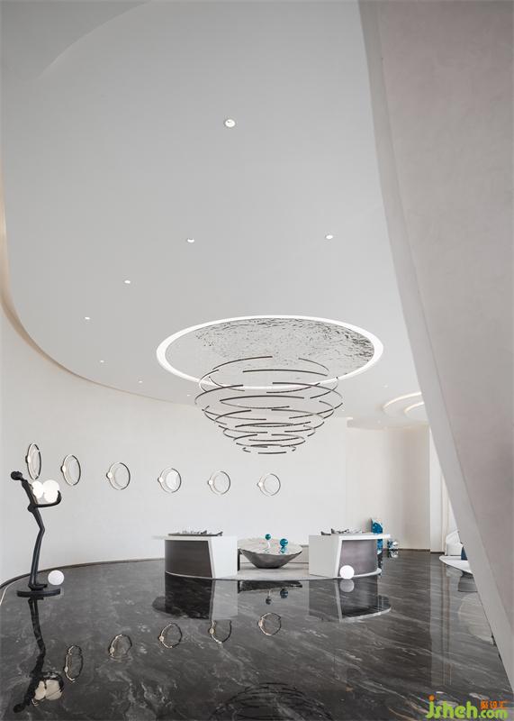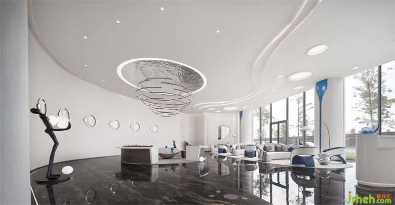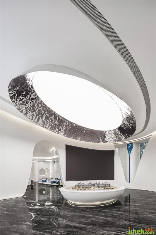 月的化形,水的意境,组成沙盘区艺术结构的弧度表征,柔和的光自上而下弥漫开来,如圆月在水面投射的倒影,晕出波纹般的流光。入口接待区四周洒落的点点星光,是自然意象与当代材质碰撞出的诗意,犹如洞中萤火虫发出荧光,让四周变得梦幻起来。