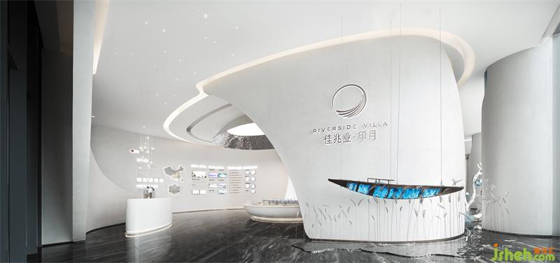 “故事从乘一叶扁舟开始,泛舟湖上,印着月影逍遥而游”。微风徐徐,月色微蓝,泛舟划桨,伴着星光与芦苇荡,向着温润的月色走去..... 营销中心设计从泛舟人的视觉进入,落足于“水纹”“月相”的意向之中,以灵动的体块延伸出多重的空间韵律。
