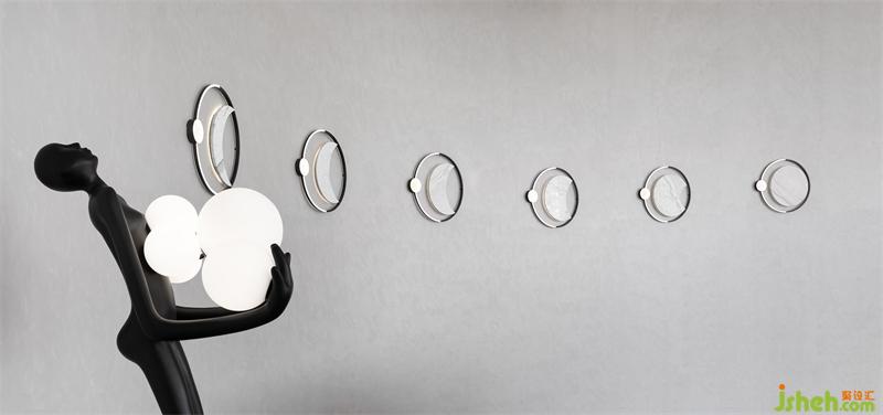 沙龙卡座区整体呈开放姿态,绵延的月相灯饰和镜面天花相碰撞,营销中心设计以流动的韵律呼应中轴线上的金属艺术装置,赋予了视觉强烈的冲击力。一条条游走于空间的线条,是潮起潮落的表象,让观者开启奇幻的江影月相之旅。