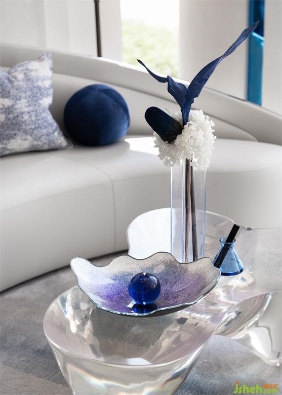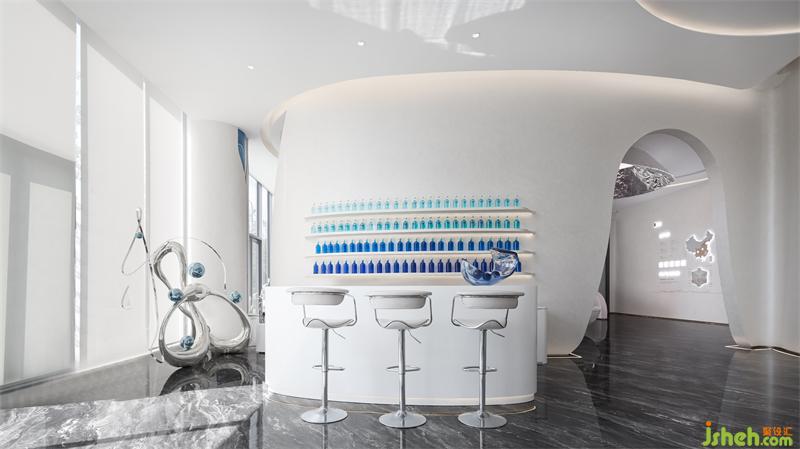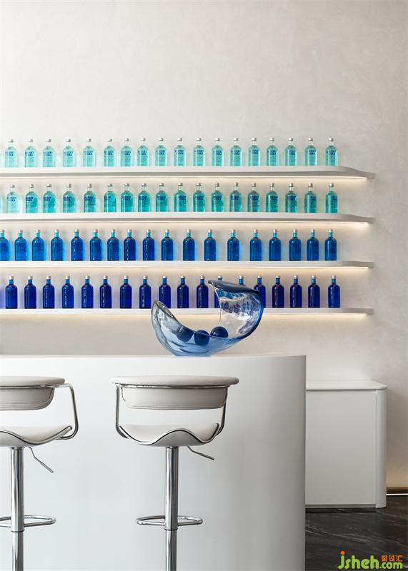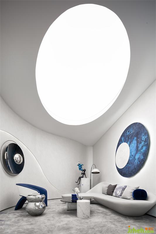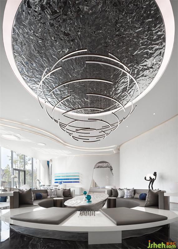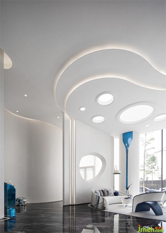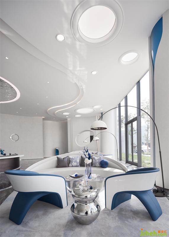 营销中心设计层叠的顶面通过具有延展性的灯带勾勒出空间的轮廓感,流动的手法糅合充足的采光,虚实结合,抽象画卷的诗意格调弥漫一室。空间搭配高级的静谧蓝调,表达出盛唐的繁华与浣花的清澈。