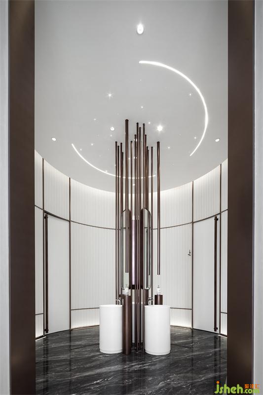 卫生间前厅灵感取自于望江公园的重叠竹韵,或交织成廊,或夹道幽境,在现代金属材质的结合下,雅致在空间内展现得淋漓尽致。