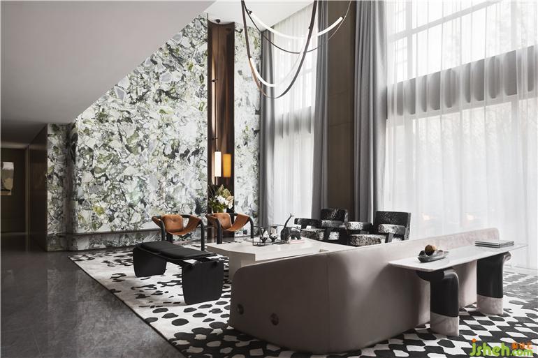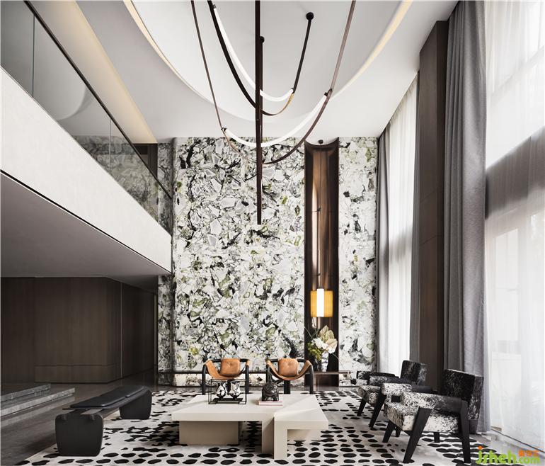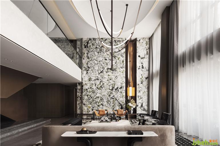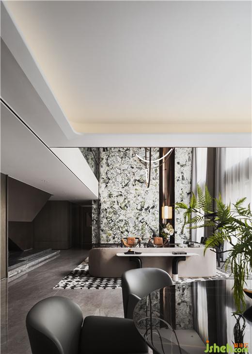 蜿蜒回转一抹绿,点燃了现代风情,蕴藏着东方美学,张扬出静谧自然。样板间设计客厅整体挑高设计,每一面都有令人惊喜的视觉存在。天光自高处倾泻而下,整体空间以白色为基底,木与灰,利落的界定了不同场域。经历千方洗礼的天然纹理冷翡翠大理石成为开放式空间的中心,随性而富有设计感,在围合之势中形成强烈的对话。