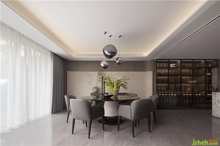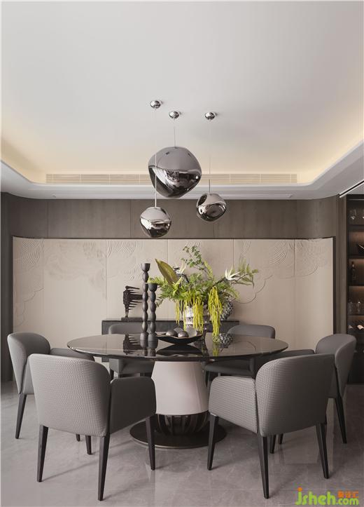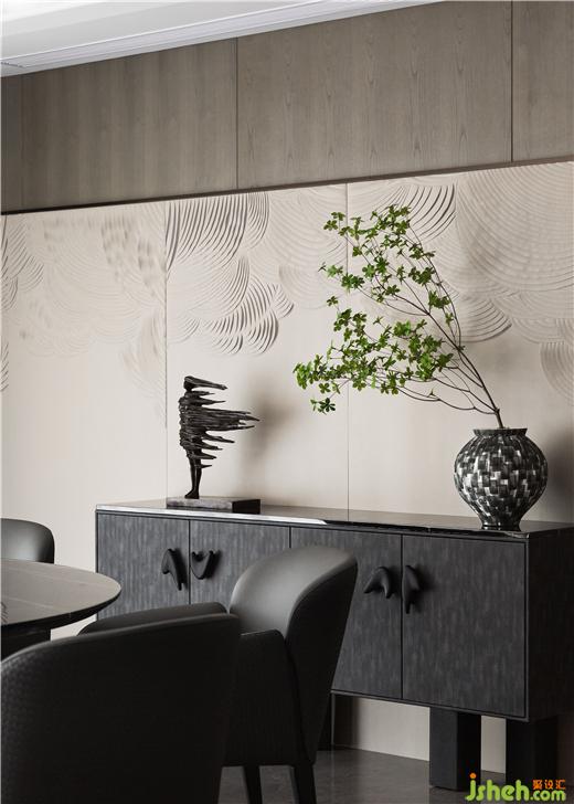 多元开放,围而不合。客厅、西厨与餐厅之间既有明显的划分界限,又相互渗透。样板间设计深色木饰面与立体的皮革屏风色彩变化平缓且过渡自然,屏风上的云纹贯穿整个空间,在光影之下,自然景观与室内对比鲜明却又不显突兀。餐桌椅以圆润的弧度承载舒适功能,玻璃橱柜如同小型的陈列场,在光影、饰品的点缀下,优雅的氛围更加浓郁。