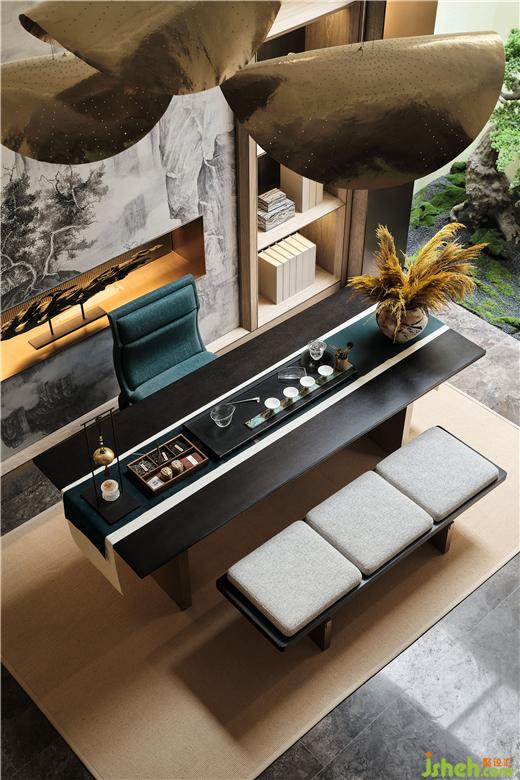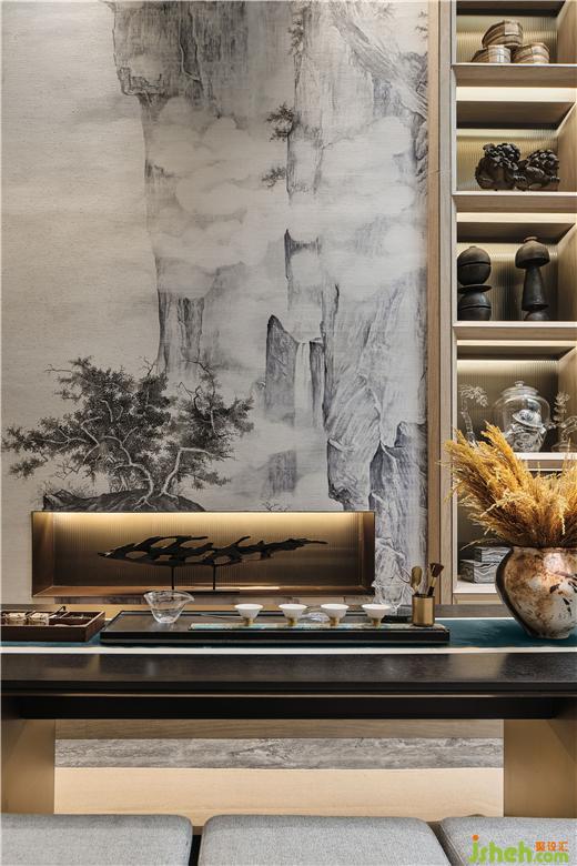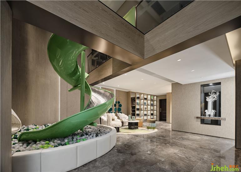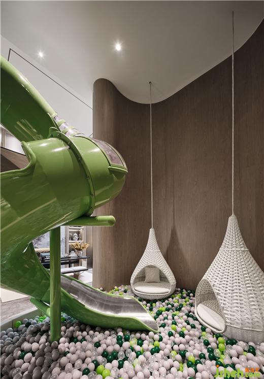 儿童娱乐区的绿色滑梯连接上下两层,让家里秒变游乐场。童趣元素和艺术陈设的叠搭,中铁建样板间设计为孩子创造充满趣味的成长空间。茶室自有雅趣,一盏茶壶、几缕幽香,稳重的深色系在空间中铺陈,亲切平和地呈现温润而安然的理想生活形态。