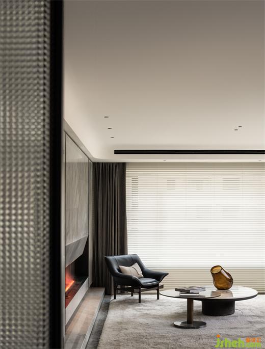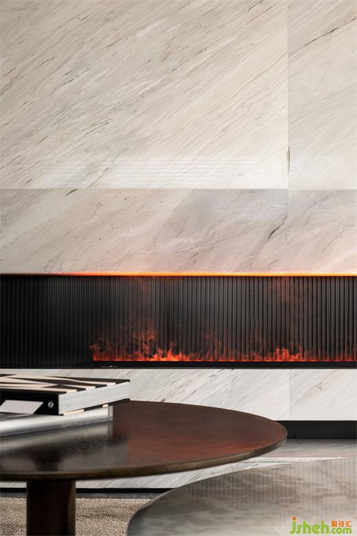 整面石材电视墙、流线型的沙发座椅以及金属石材茶几,样板间设计围合出舒适通透的交流场域,看似冲突的材质在形态的围合中微妙相洽,形成空间的层次。