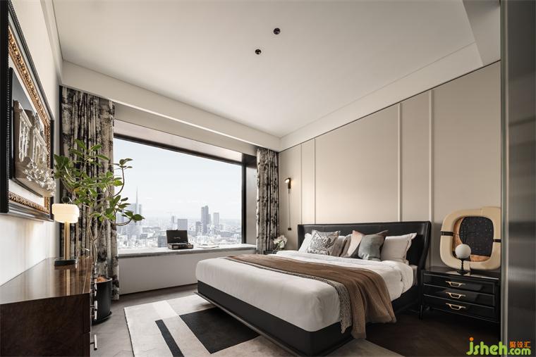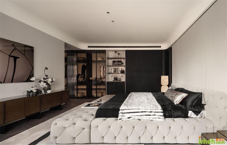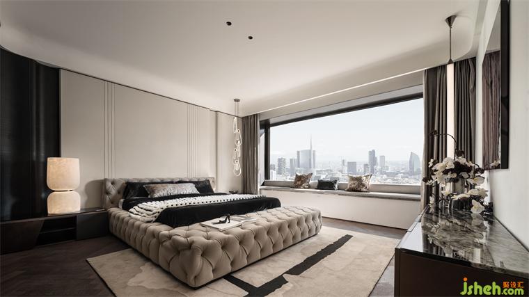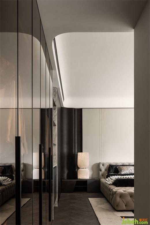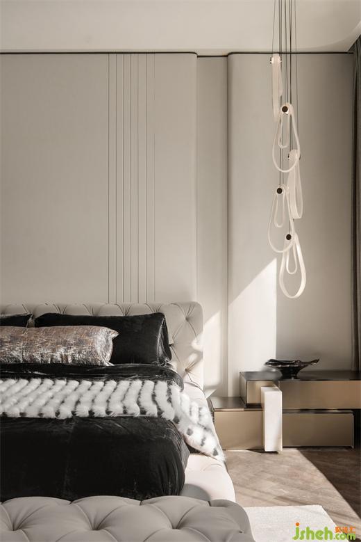 主卧将光影、肌理、质感、温度相互叠加,是藏匿在细节中的生活美学。样板间设计整体色调以浅色为主,搭配暖白与黑色木饰面,在柔软与硬朗的质感交错中,勾勒出内敛而优雅的空间尺度。