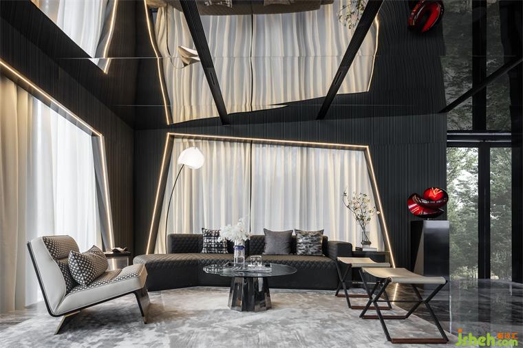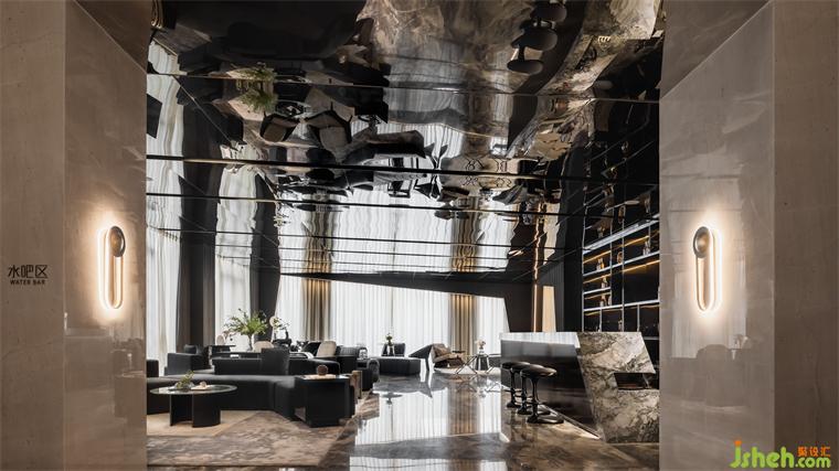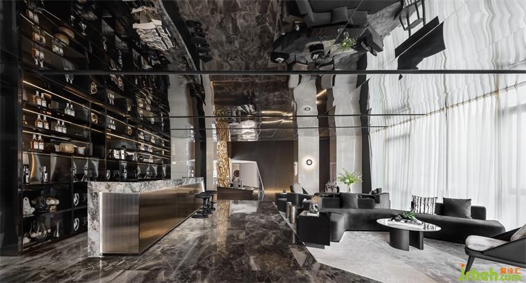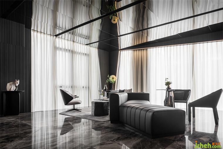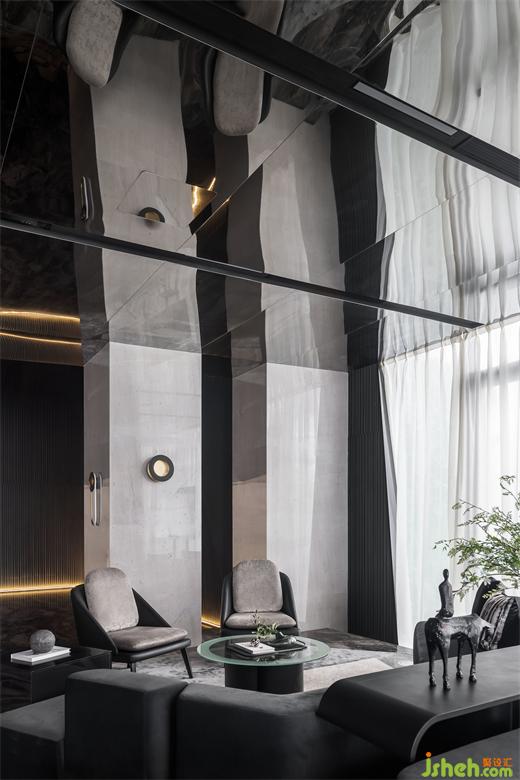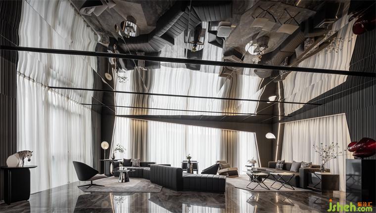 延续宇宙的神秘,洽谈区空间以大量镜面材料为背景,顶面采用灰镜斜面设计,实现纵深感。不规则异形窗框的使用,渲染出充满生机的空间力量。在精准的比例中,用严谨的几何秩序来构建感性的场域,生活的姿态与宇宙的无尽在这一刻得以共鸣。