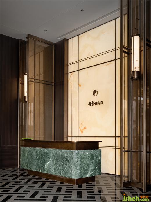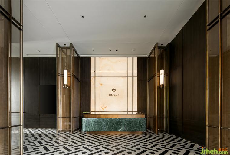 接待厅设计着力于传统对称美学的追求与沿袭,通过通高艺术屏风、云石壁灯与超大尺度天然玉石造景,取意现代美学的形态气韵,构设微缩的湖岸意境。墙面以深色木饰面为底色,配以艺术玻璃、少量金属及玉石打破沉闷,加以普拉达绿奢石作为跳色点缀,于赏心悦目间,勾勒出清丽古朴的画卷,以美好姿态迎接远方贵客。