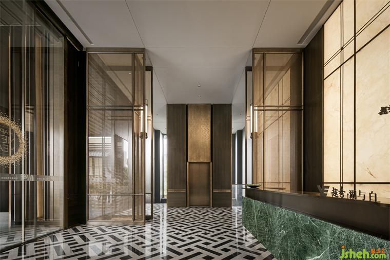 电梯厅延续深色木饰面,营销中心设计采用通高金属板装饰电梯门头,加以越秀logo渐变排布的蚀刻设计,增添趣味性。在玻璃和屏风的映衬下,漫漫光影,似漏非漏,如同一只翱翔天际的鲲鹏,徐徐相迎,引人入境。