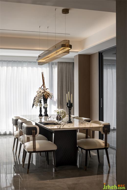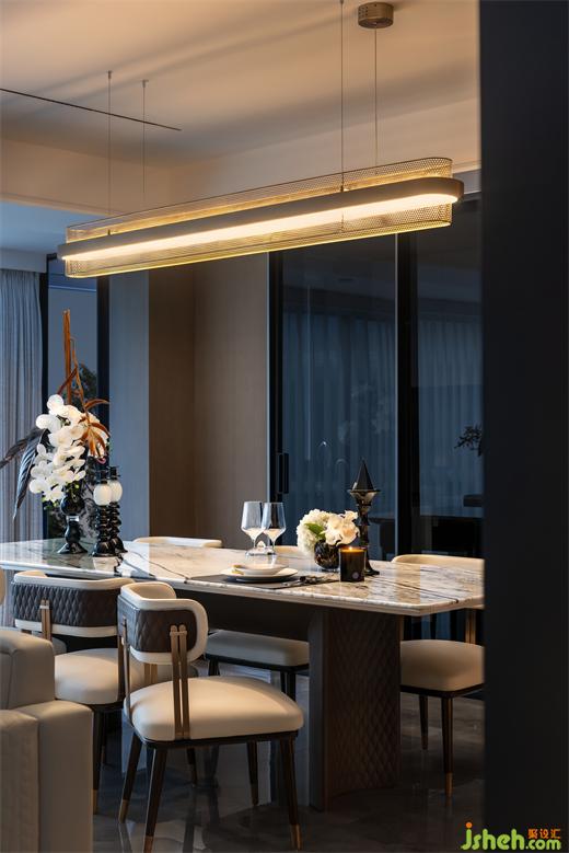 餐厅将剩余客厅空间有效整合,串联起场域与生活。在开放联动的布局中,各显其美。餐桌的杯盏奏响一日三餐的乐章,在柴米油盐的熏染中,于此处感受着升腾的人间烟火。