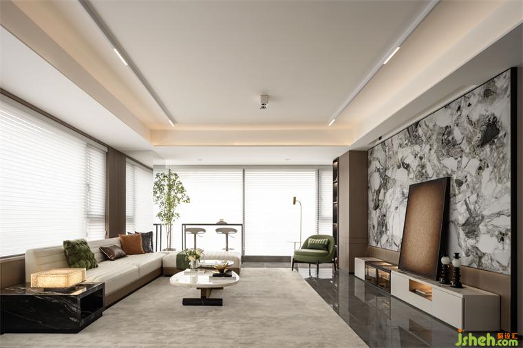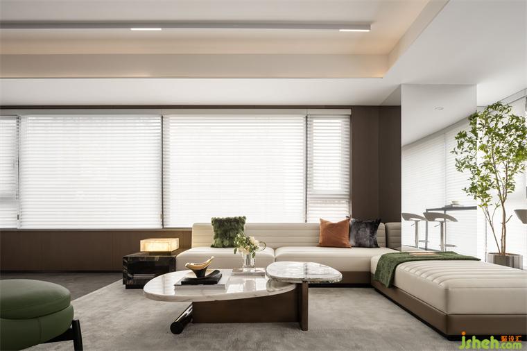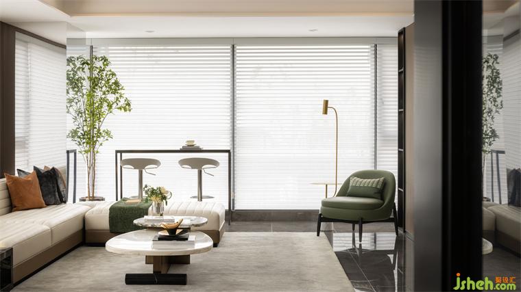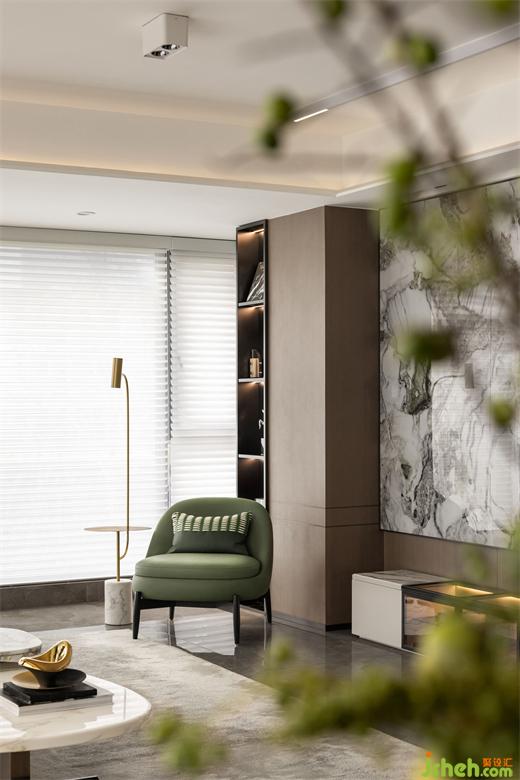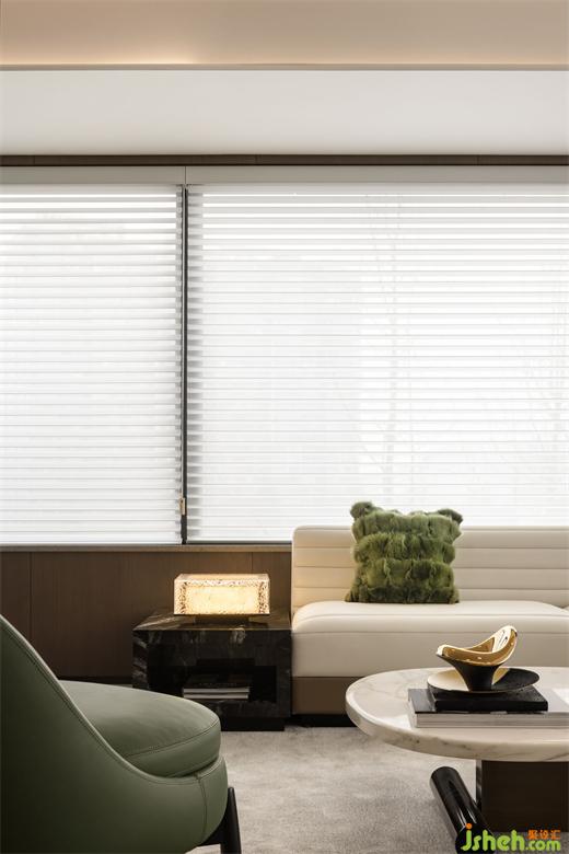 整体色调以大块面的白为主,彰显干净明快的现代气质。局部以绿与棕点缀,在奢石、木饰面、织物等材质多元组合下,彼此渗透,融而不杂,释放出精奢趣致的浪漫情怀。