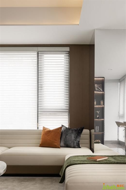 客厅以摩登都会为内核延伸塑造,样板间设计运用纯粹的现代手法打破重构,从颜色符号到形制元素,细腻柔和,大尺度落地窗的加载,共筑雅奢生活的精致范本。