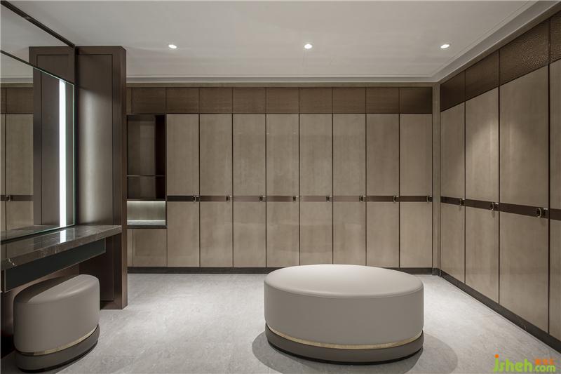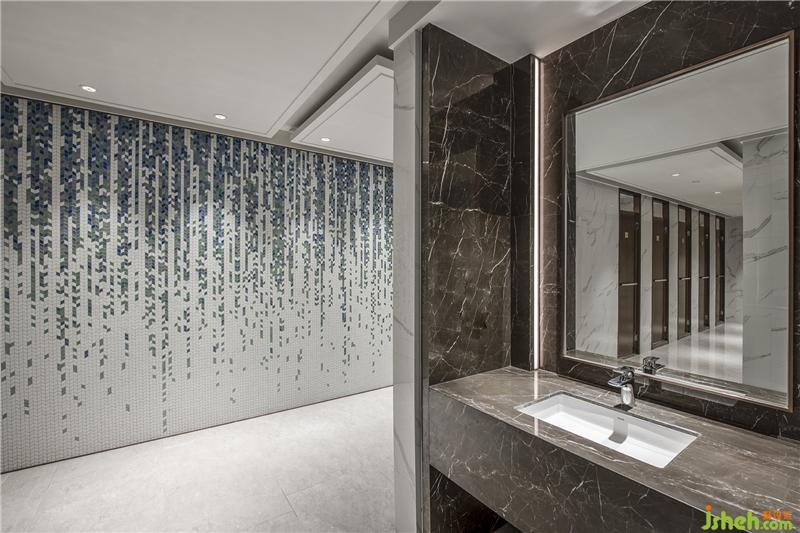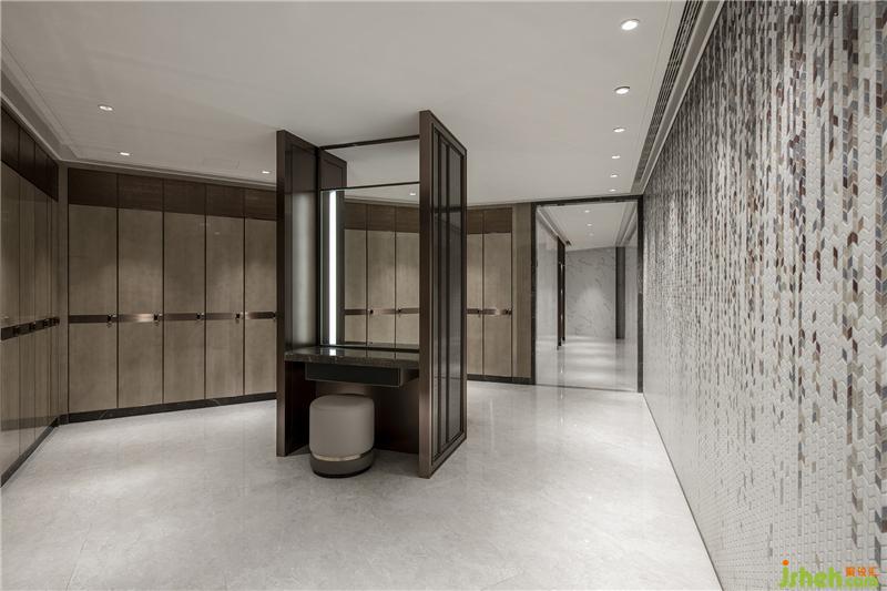 利用更衣柜定制的金属凹凸板,拓展了空间的立体感,保证了私密性的同时消除了空间的逼仄感。整面马赛克墙是装饰上的亮点,不仅与更衣室的主题氛围相得益彰,更让整体空间在中规中矩的布局中有了意识形态上的灵活变化。为照顾主观感受和体验,梳妆台及台盆都加设了条形灯光,凸显了人性化的设计理念。