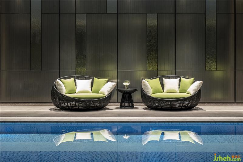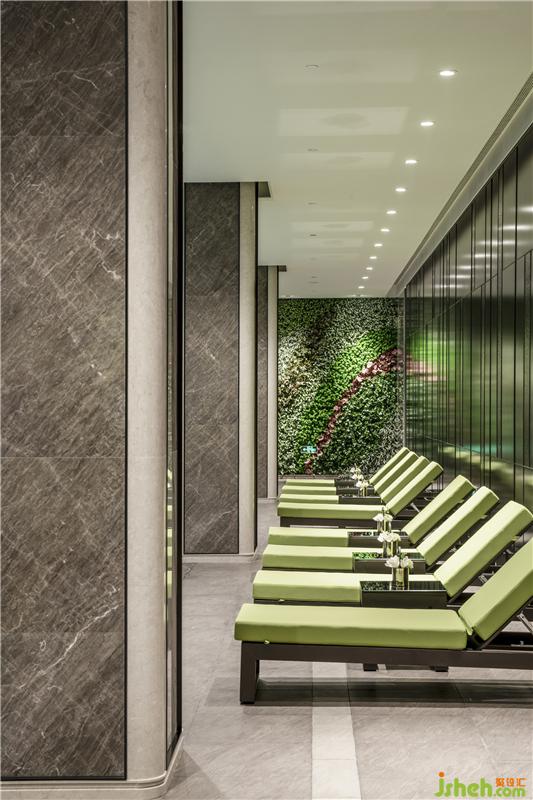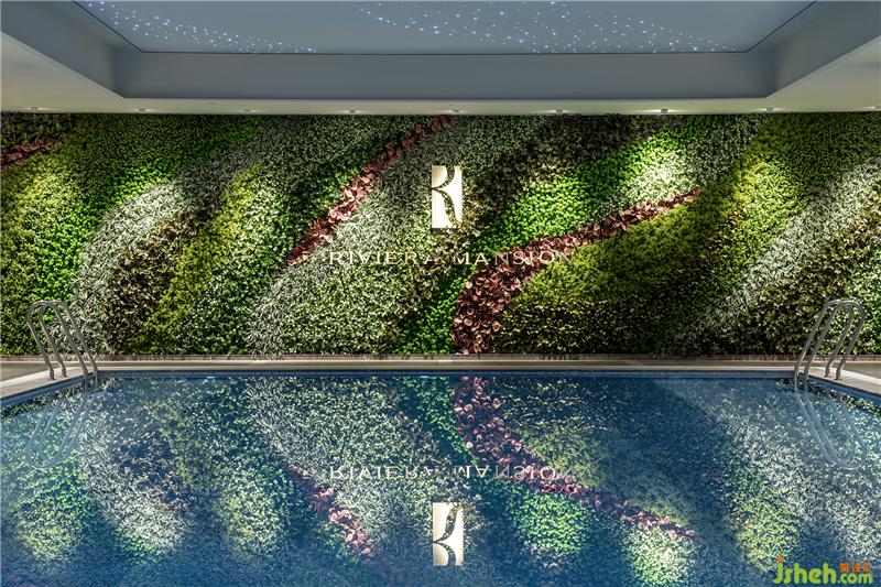 每一处细节的悉心考究,模糊了室内外的界限。泳池尽头是一整片植物墙,浅青、深绿、红棕……不同植物构成一条条斑斓的色带,层次分明又浑然一体,不仅具备强烈的视觉冲击感,也渲染出了十足的自然气息。