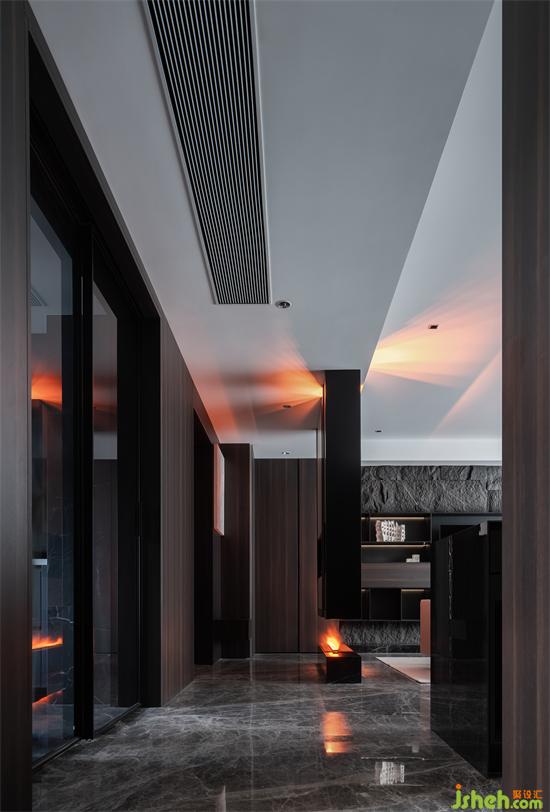 离,便是将空间结构重新划分,我们在门厅处设置了一个悬浮的镂空玄关,这样既有效地保证了入户的储物需求,也能更好的兼具沙发区域的隐私。家装设计仪式感便由此而来