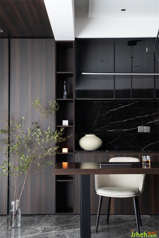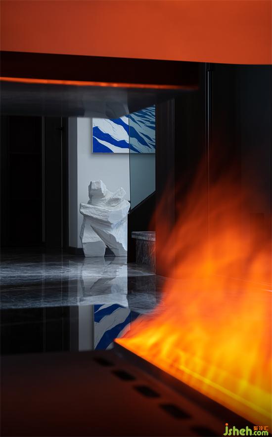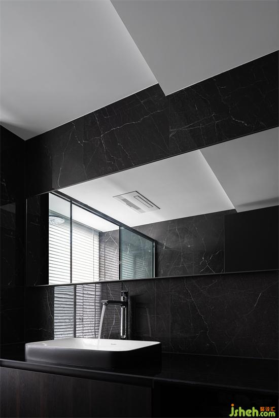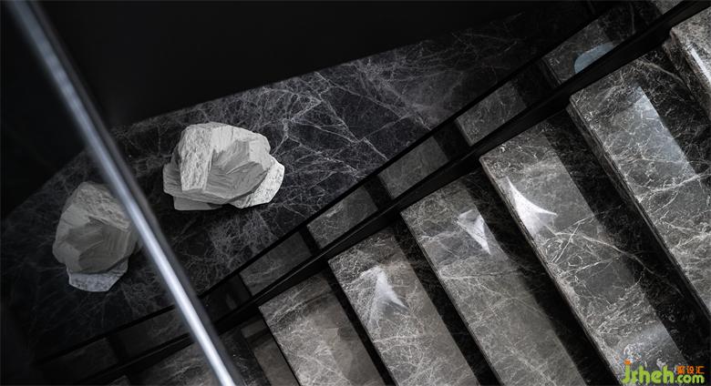 石材一体化铺贴淡化了空间的分割感,一楼公区与楼上休息区空间上分离 材质上贯通家装设计