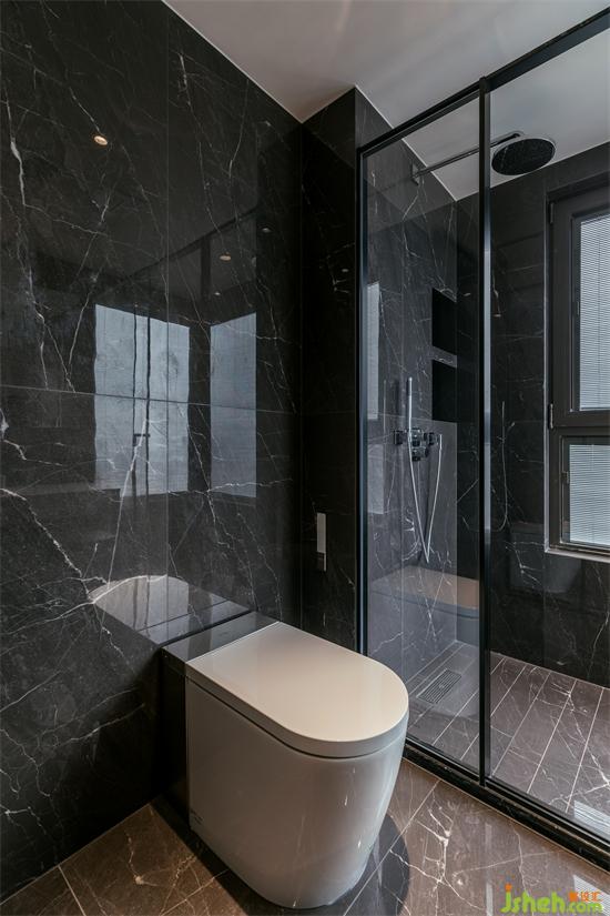 而卫生间则采用冷静的家装设计手法,黑色的板岩白色的陶瓷,现代又简洁。