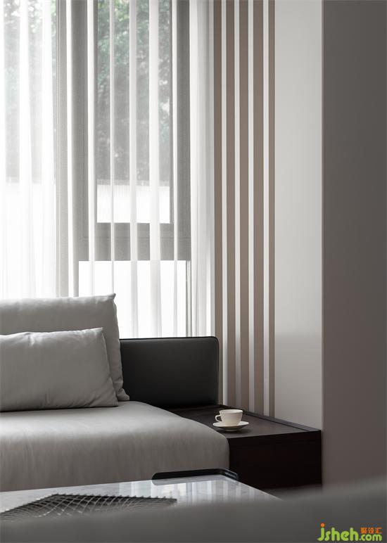 受限于建筑中原有的承重柱,客厅的布局上便打破常规,以柱子为边界,将会客区打造成相对而坐的布局,反而更加强调互动的属性感,与柱子平行设计了阵列的同色格栅,进而进一步弱化承重柱的厚重感。