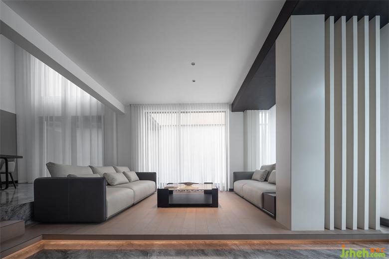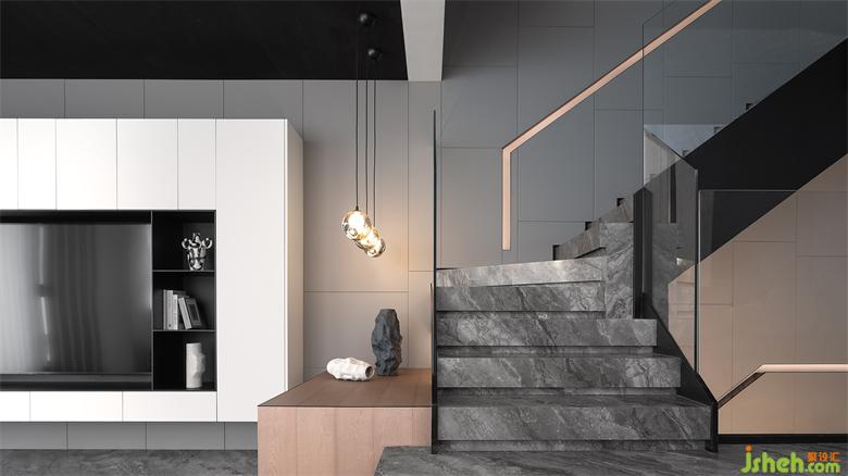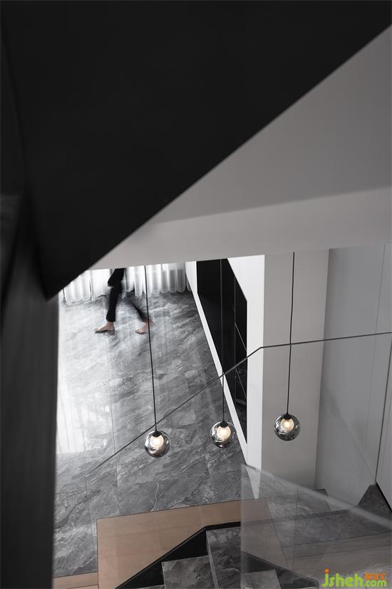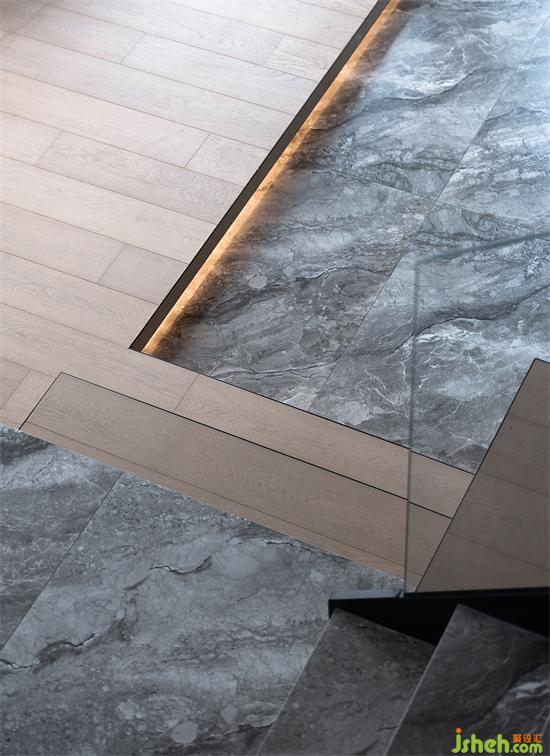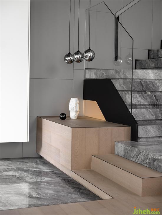 用解构的手法将空间进行了重新的区域划分,不仅仅是平面上的布局调整,也涉及到纵深层面的结构搭建。别墅设计建筑跃层的结构为空间层次的丰富性提供了更多的可能,打破楼梯的固有形态,用石头和木地板的材质冲撞把会客区做了明确的功能提炼,也为空间增添温润质感。