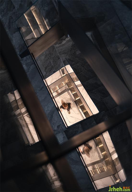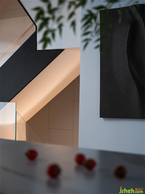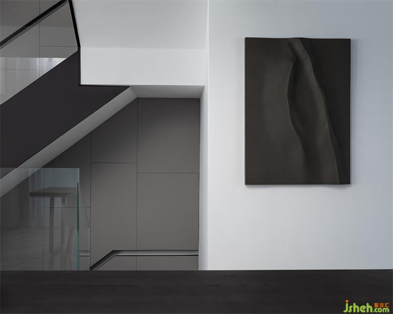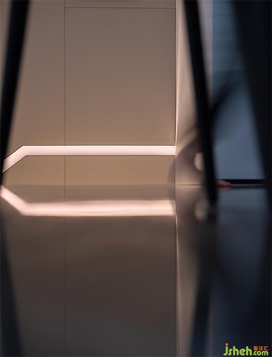 The depth scale of the space is simplified. The wall of the staircase is flattened in the form of wrapping pillars to make the shape of embedded handrails. Under the guidance of light and shadow, it guides the moving lines up and down. Step and ground integrated material, extremely narrow embedded step light belt, frameless and wall of the same color door all emphasize that this is a minimalist space.
