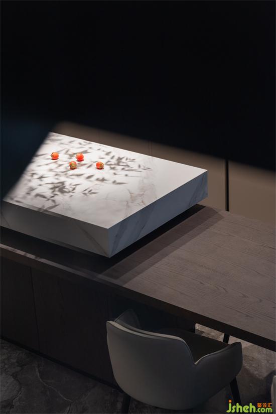 餐厨区域做了开放式一体化的布局,没有了墙体的束缚,空间的通透感便更加明显,岛台与餐桌呈一字型穿插链接,餐厅上空做了挑空的处理,在空间的高度上也有了上佳的体现,大气与舒适度一直贯穿设计的始终。