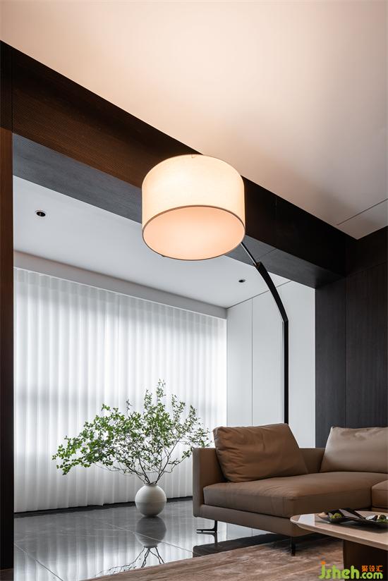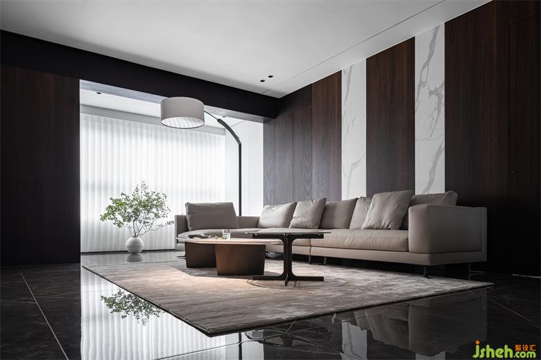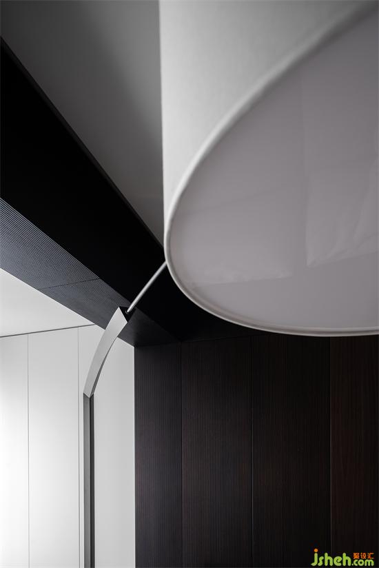设计的都市感,黑白永远被追捧,极具质感的烟熏橡木木皮把空间的基调做了铺陈,山水樾澜庭家装设计白色的岩板点缀其中,无疑提升了材料的现代感,墙面延伸至顶面的线形灯光贯通了材料的链接关系。