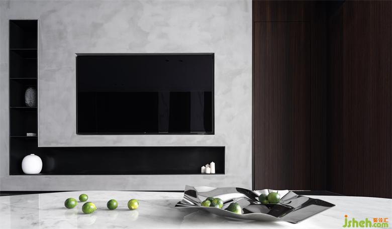 清水混凝土质感的艺术漆勾勒出电视墙的大致线条,完全内嵌的电视机与不锈钢超薄开放层板营造出简约的处理手法。
