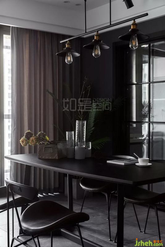 餐桌采用棕黑色木面,搭配蚂蚁凳,加上黑色铁艺、复古吊灯,形成工业风的独具气质