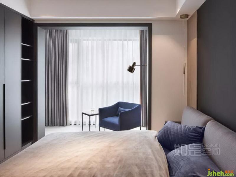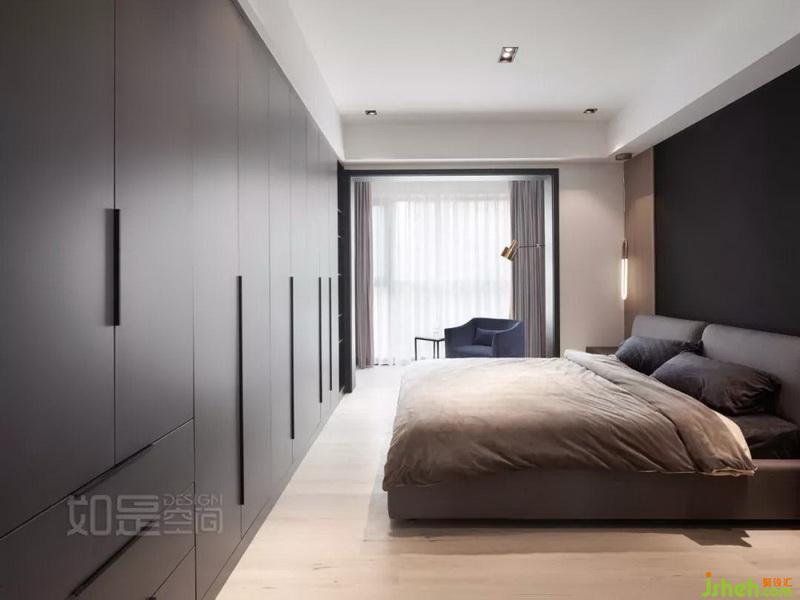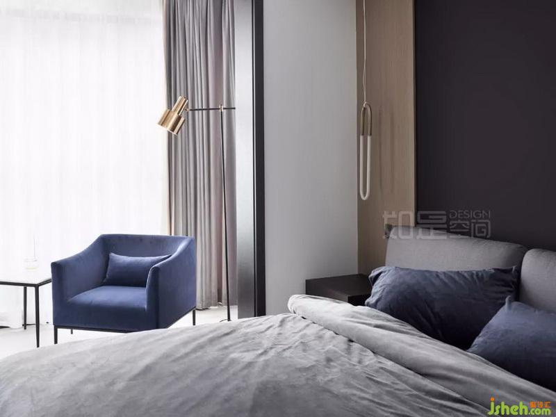 主卧的墙面背景室内设计师选用了暗色系,床体的灰色靠背则在背景的黑色和木色之间起了很好的调和。