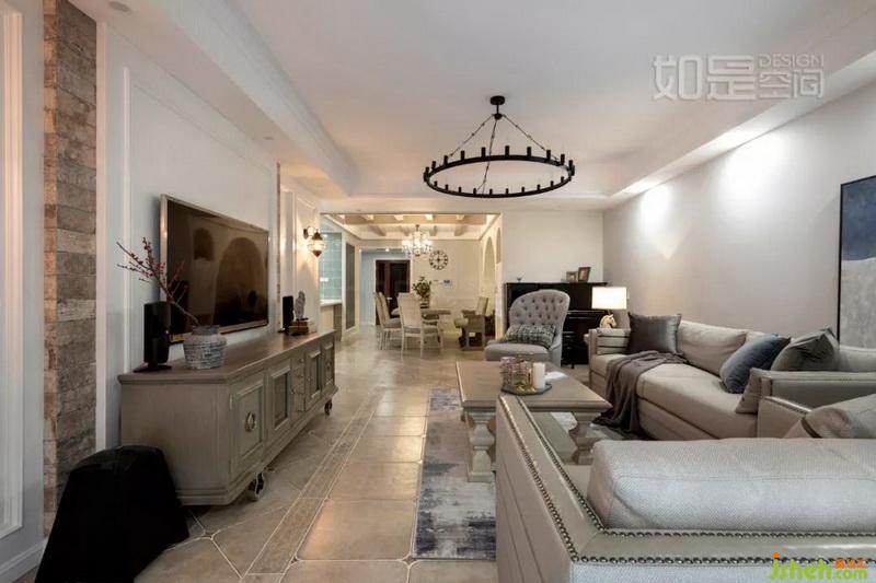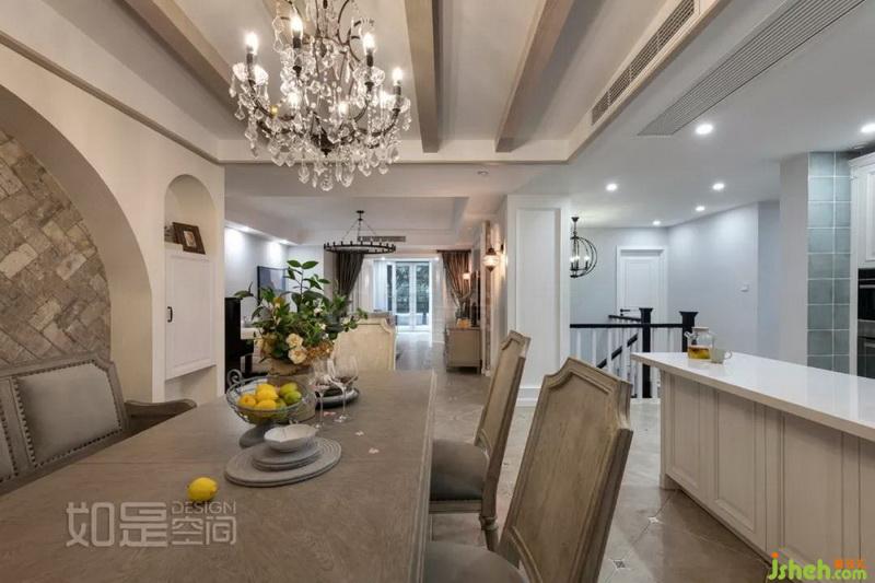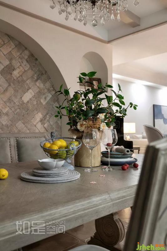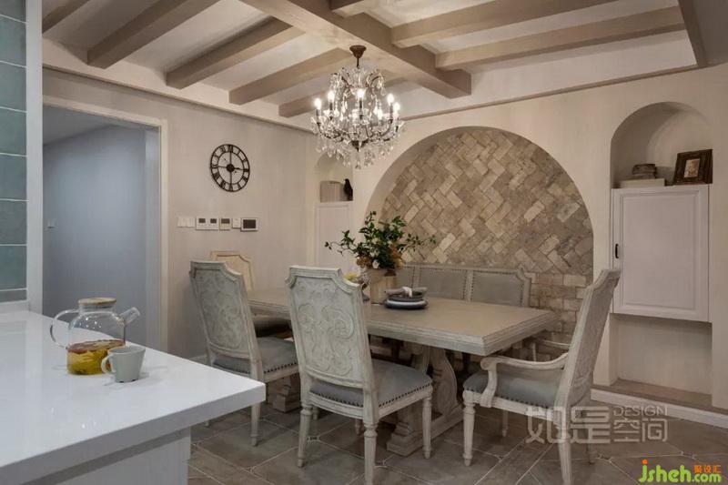 餐厅背景墙采用了对称的设计,左右的柜子有一定的收纳功能。中间精致的人字形文化石铺贴出优雅大气且带复古气息的空间氛围,吊顶则采用复古做旧的KD板饰面