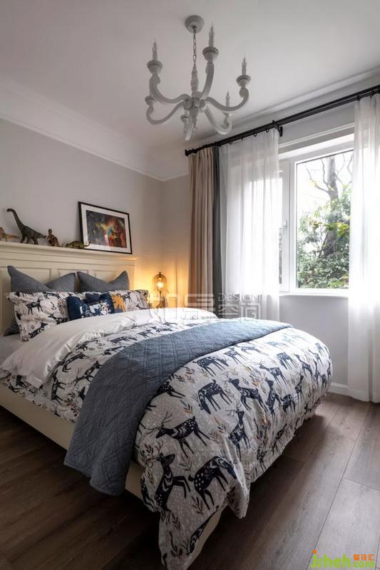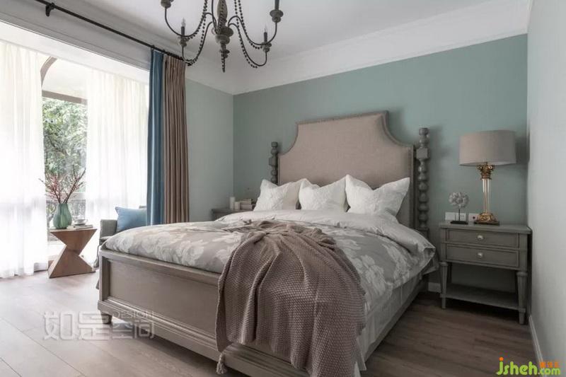 主卧色调为清新灰绿色,背景色略深一号,层次分明。家具采用和客厅同色系的烟灰色木系。吊灯让人感受到浓浓的复古情怀,彰显屋主优雅气质。