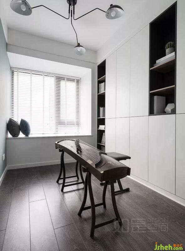 色彩运用上,这里有别于客餐厅区,局部绿色墙面能让人心情焕然一新。白色书柜,有助于营造宁静感;而古筝则尽显一家人的优雅。