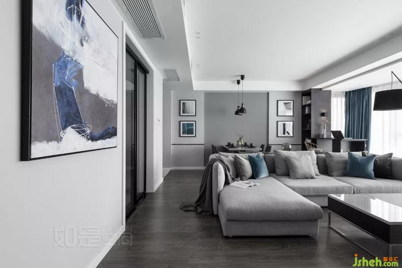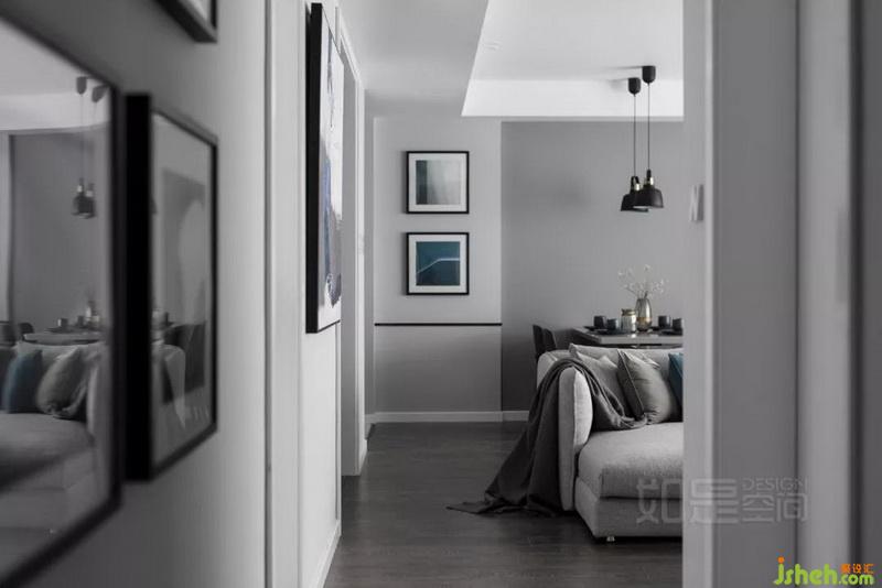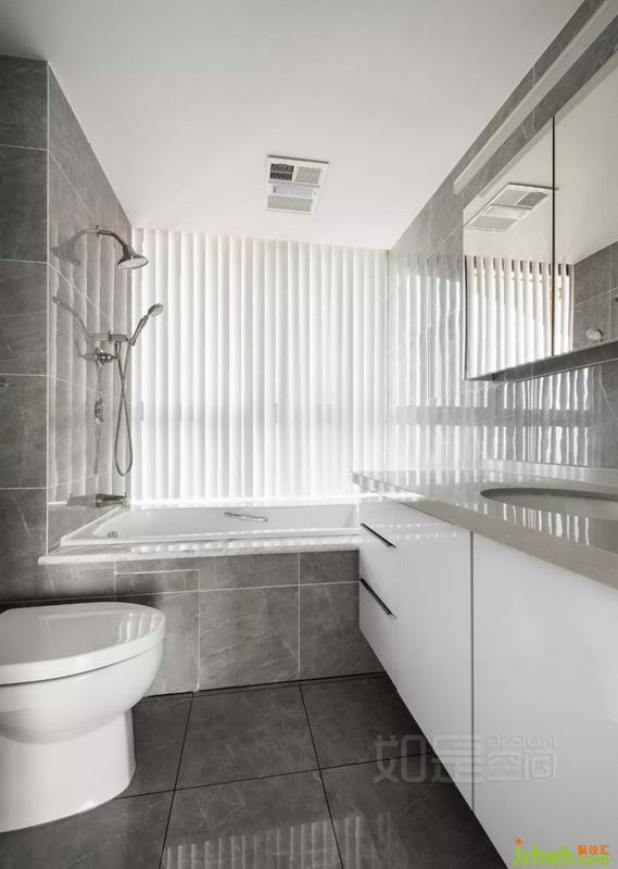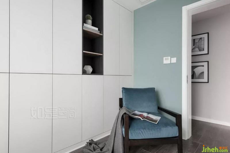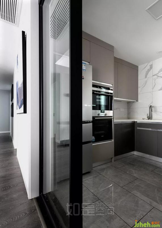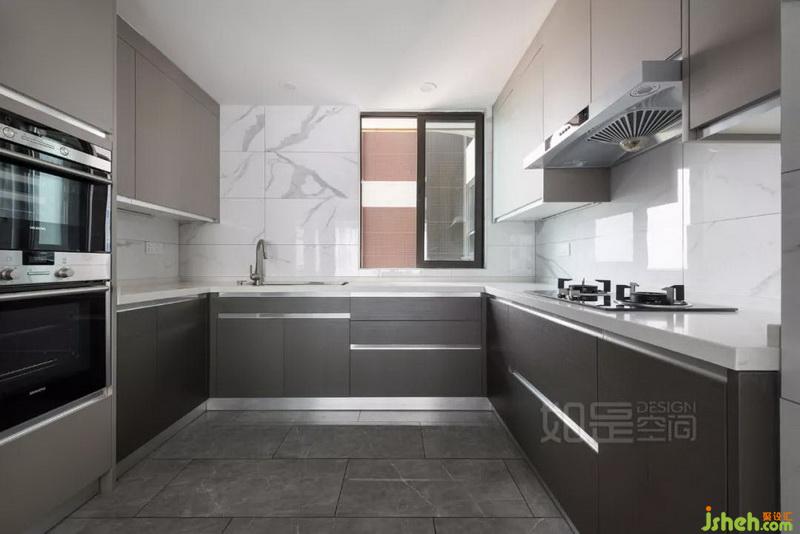 浅色墙顶面与台面、略深色的柜门与地面,巧妙营造出现代简约感