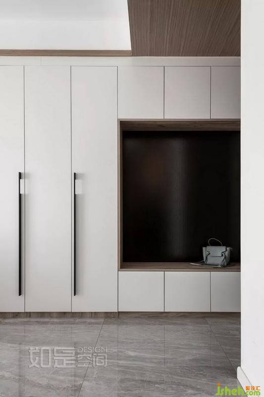 鞋柜采用开放式设计,让原本偏长的柜体产生了丰富的层次感,同时也满足了家里老人和小孩在换鞋时要用到换鞋凳的需求。