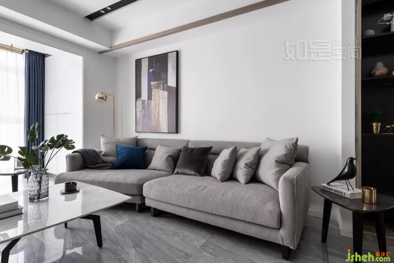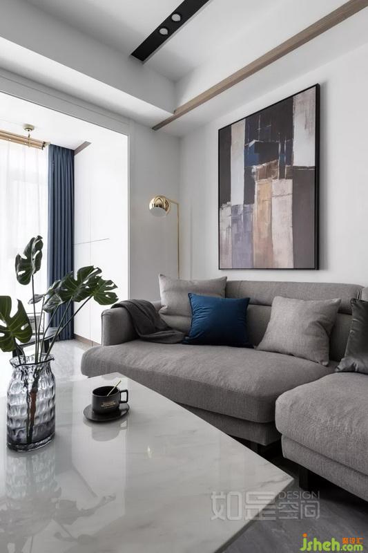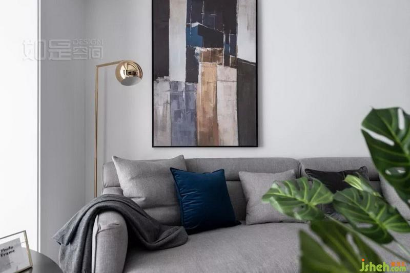 沙发背景区域放弃过多装饰与复杂设计。落地灯的使用,提升了空间品味。这里的抽象画与抱枕、窗帘,皆在色彩上进行着相互呼应,构成和谐画面。