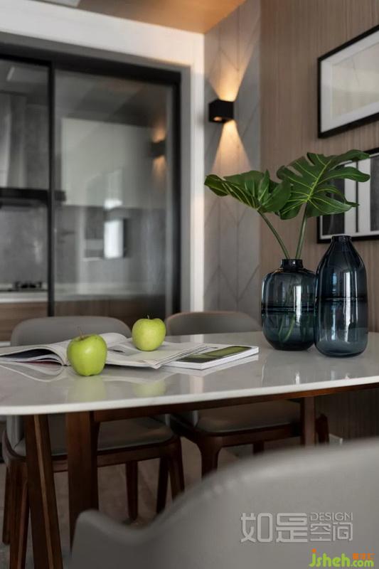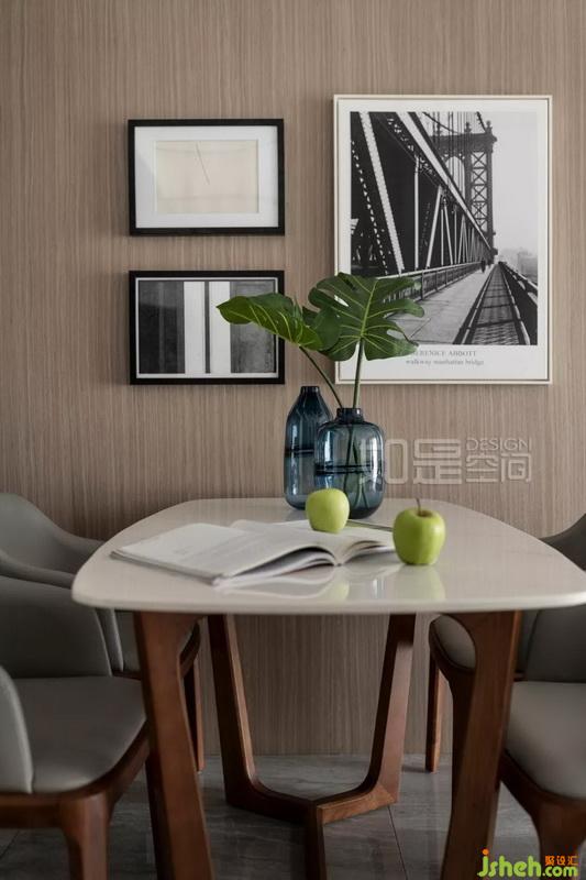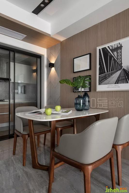 现代风格的餐厅区域,如果黑白灰基调过重,则可能缺乏温馨感与用餐氛围,所以这里采用了大面积木饰面,巧妙化解了这一问题。