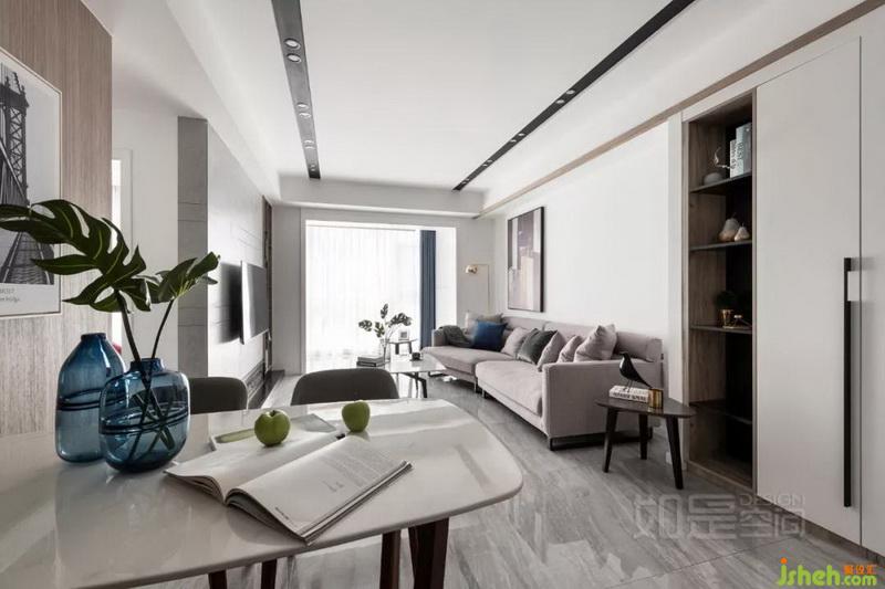 电视墙与餐厅墙,都使用了灰色哑光大砖,让整体色调和谐一致。色调与材质的统一化,让小空间的视觉复杂度降低,也在无形中放大了小户型的空间感。