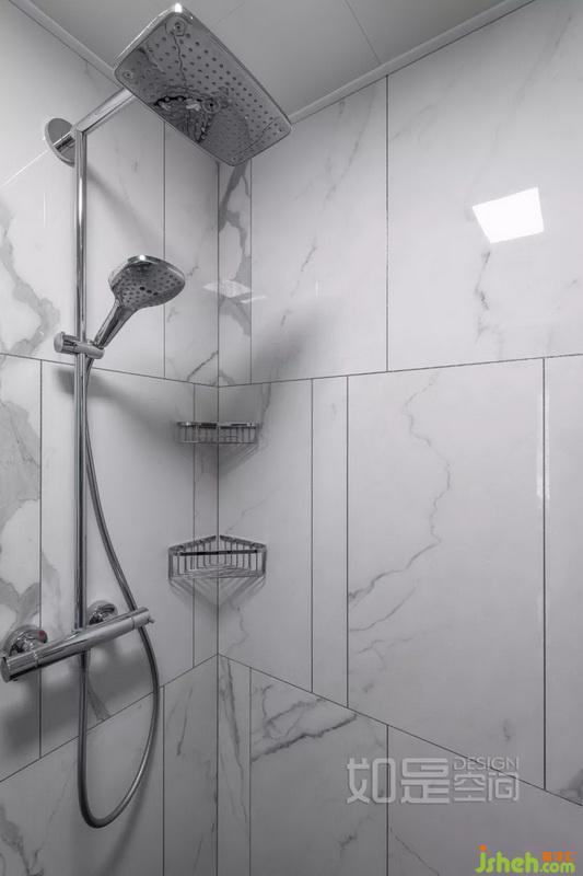 白色大理石砖铺满整个卫生间,给人干净整洁的感受。大小不同,错缝铺贴,简单中透着变化。