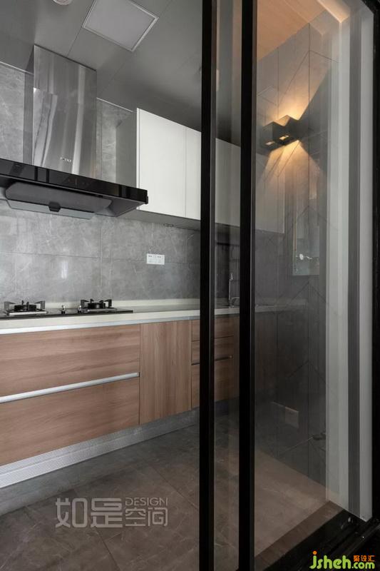 极窄边框玻璃滑动门,室内设计师把厨房分隔成一个半封闭的使用空间,同时也保持了整体通透简洁感。
