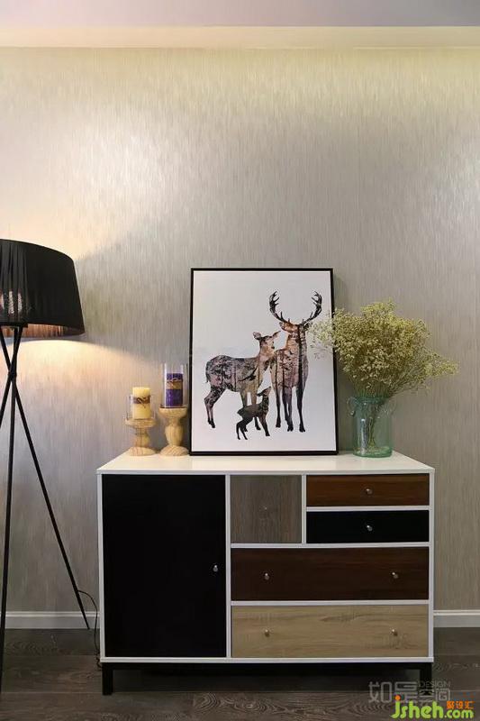 斗柜和落地灯的放置,可以让入户到沙发的距离感缩短,避免了通道显得过长的缺陷。且斗柜和落地灯形成了高矮错落的不对称美。
