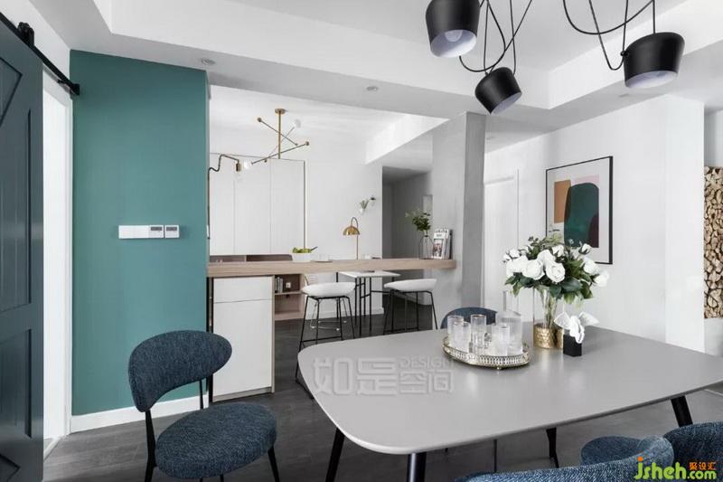 餐桌桌面室内设计师选用与餐厅茶几同色同纹理的台面,餐椅则选用了与休闲椅同色的深蓝色,形成呼应