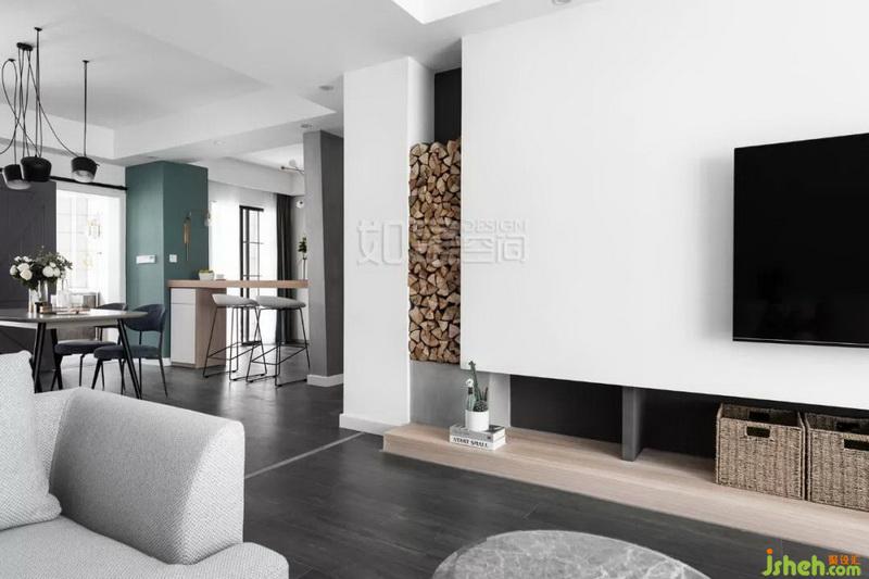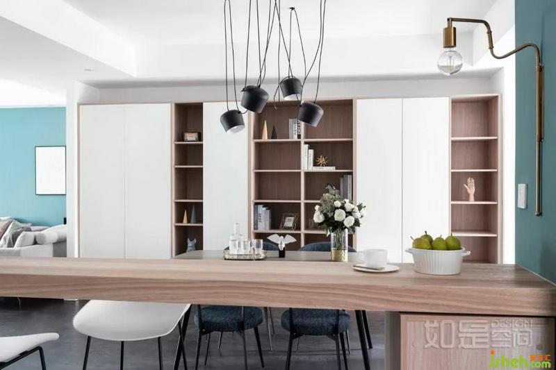 餐厅旁的过道很长,设计师在这里打造了一面局部开放的的储物柜,解决了长期居住后的巨量收纳需求,同时又显得生动活泼。兼顾了美观及实用性。