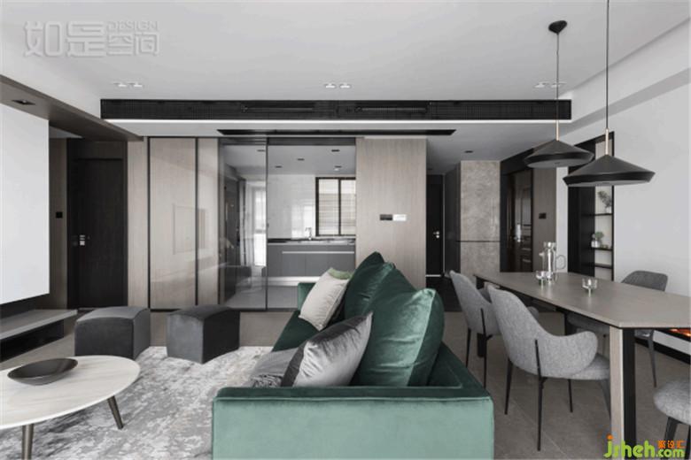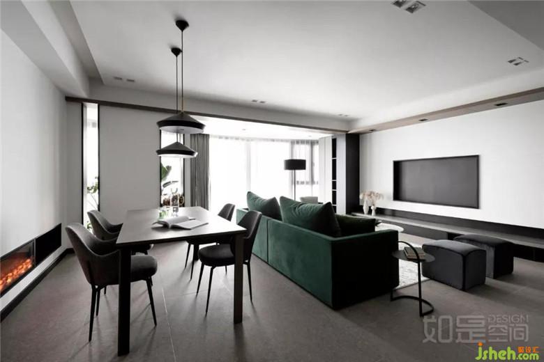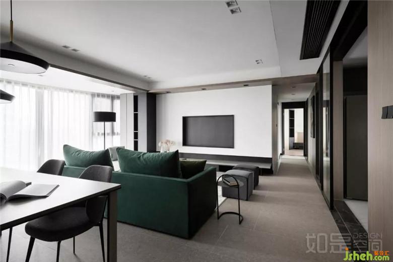 室内设计是在本次设计整体以白色结合高级灰的木饰面为基调,再搭配以经典黑。以绿色的沙发作为点睛色,展现一种对于沉静、舒适的向往